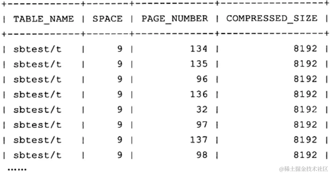 mysql> select table_name,space,page_number,compressed_size from innodb_buffer_page_lru where compressed_size <>0;