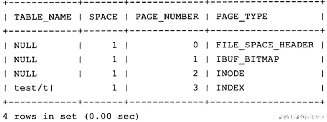 mysql> SELECT TABLE_NAME,SPACE,PAGE_NUMBER,PAGE_TYPE FROM INNODB_BUFFER_PAGE_LRU WHERE SPACE = 1;