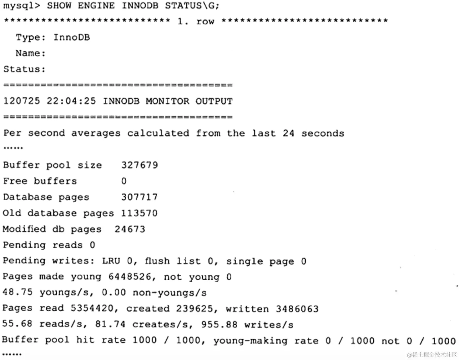 注意执行命令 SHOW ENGINE INNODB STATUS 显示的不是当前的状态,而是过去某个时间范围内 InnoDB 存储引擎的状态。从上面的例子可以发现, Per second averages calculated from the last 24 seconds 代表的信息为过去 24 秒内的数据库状态。从 InnoDB 1.2 版本开始,还可以通过表 INNODB BUFFER POOL STATS 来观察缓冲池的运行状态,如: