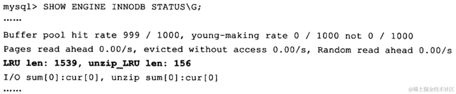 Inno OB 存储引擎从 1.0.x 版本开始支持压缩页的功能,即将原本 16 KB 的页压缩为1KB 、2KB 、4KB 和8KB 。而由于页的大小发生了变化, LRU 列表也有了些许的改变。对于非 16KB 的页,是通过 unzip _ LRU 列表进行管理的。通过命令 show engine innodb status可以观察到如下内容: