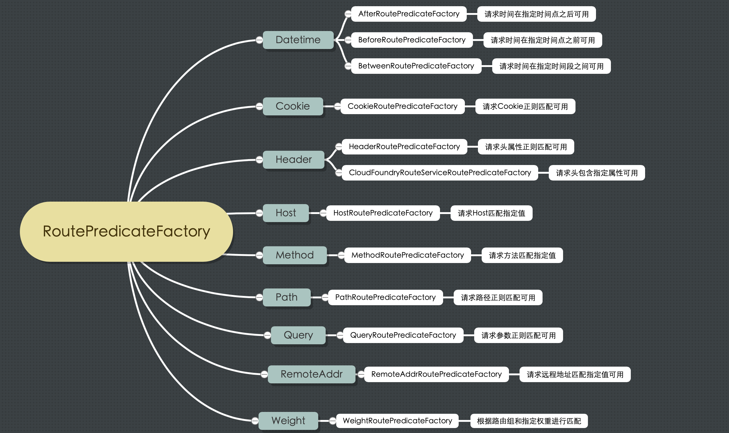 路由断言工厂 RoutePredicateFactory 包含的主要实现类如图所示,包括 Datetime、 请求的远端地址、 路由权重、 请求头、 Host 地址、 请求方法、 请求路径和请求参数等类型的路由断言。