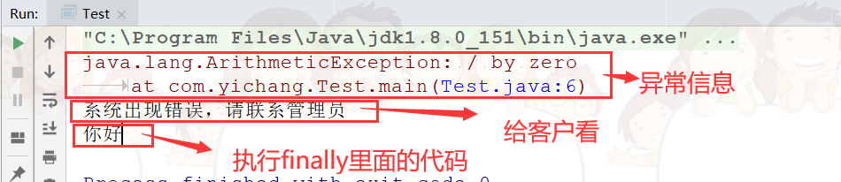 从上面代码和运行结果中,我们不难看出在控制台没有打印出你好。出现这种情况,是因为在JVM捕获到异常后,程序会终止。换句话说,在由JVM来处理错误的时候,此时,程序会终止,因此异常之后的代码就无法运行了。我们可以根据生活实例想想,什么时候百度会因为搜不到东西停服务,肯定是不会的,因此我们后面要做的就是如何在异常到达JVM之前把异常拦下来,自己单独处理,就不要麻烦JVM了。