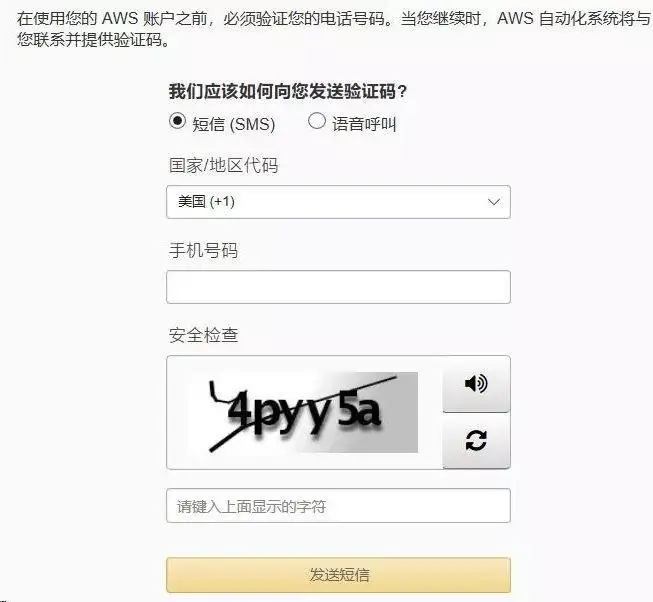 点击发送短信(短信SMS)按钮或联系我(语音呼叫)按钮。你会很快收到AWS发来的确认信息或电话并依据指导完成身份验证操作。