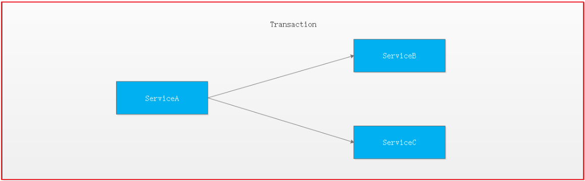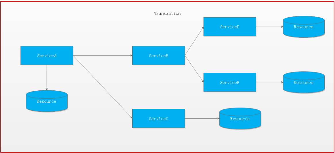对于上面介绍的分布式事务应用架构,尽管一个服务操作会访问多个数据库资源,但是毕竟整个事务还是控制在单一服务的内部。如果一个服务操作需要调用另外一个服务,这时的事务就需要跨越多个服务了。在这种情况下,起始于某个服务的事务在调用另外一个服务的时候,需要以某种机制流转到另外一个服务,从而使被调用的服务访问的资源也自动加入到该事务当中来。下图反映了这样一个跨越多个服务的分布式事务: