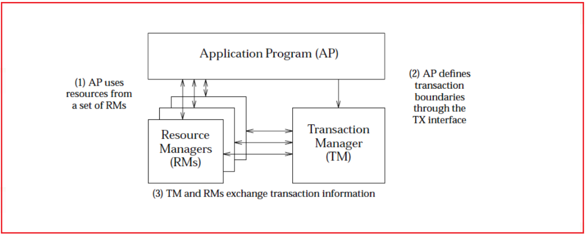 其中应用程序(Application Program ,简称AP):AP定义事务边界(定义事务开始和结束)并访问事务边界内的资源。