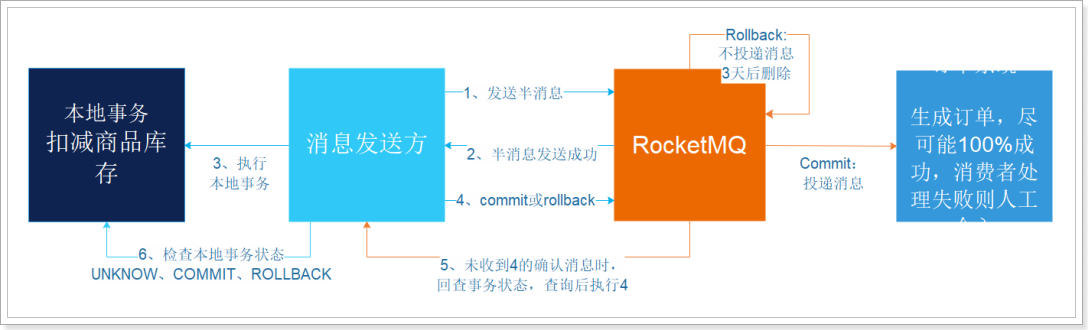 消息消费方,需要处理这个消息,并完成自己的业务逻辑。此时如果本地事务处理成功,表明已经处理成功了,如果处理失败,那么就会重试执行。如果是业务上面的失败,可以给生产方发送一个业务补偿消息,通知生产方进行回滚等操作。