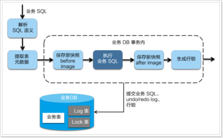 在一阶段,Seata 会拦截“业务 SQL”,首先解析 SQL 语义,找到“业务 SQL”要更新的业务数据,在业务数据被更新前,将其保存成“before image”,然后执行“业务 SQL”更新业务数据,在业务数据更新之后,再将其保存成“after image”,最后生成行锁。以上操作全部在一个数据库事务内完成,这样保证了一阶段操作的原子性。任何提交的业务数据的更新一定有相应的回滚日志存在
