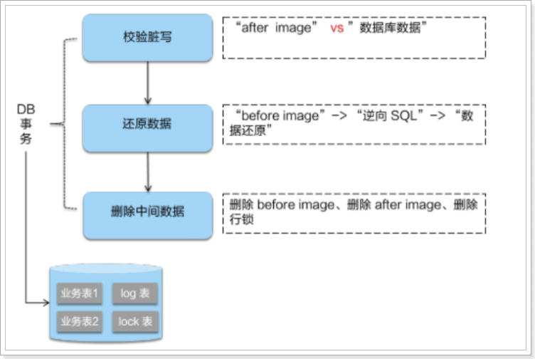 二阶段如果是回滚的话,Seata 就需要回滚一阶段已经执行的“业务 SQL”,还原业务数据。回滚方式便是用“before image”还原业务数据;但在还原前要首先要校验脏写,对比“数据库当前业务数据”和“after image”,如果两份数据完全一致就说明没有脏写,可以还原业务数据,如果不一致就说明有脏写,出现脏写就需要转人工处理。