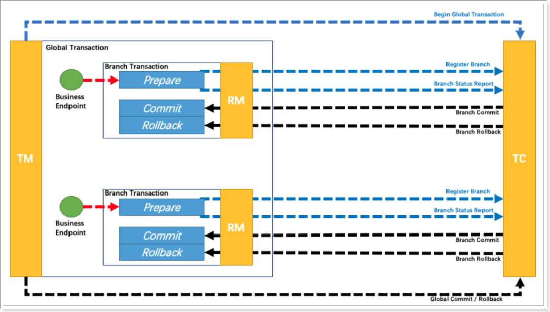 事务管理器Transaction Manager(TM): 控制全局事务的边界,负责开启一个全局事务,并最终发起全局提交或全局回滚的决议。