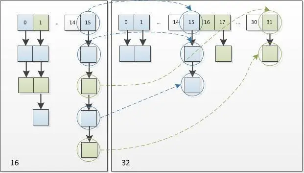 所以,我们在resize的时候,不需要重新定位,只需要看看原来的hash值在新增bit的位置上是1还是0就好了,是0的话位置没变,是1的话位置变成“原位置+oldCap”。代码比较长就不贴了,下面为16扩充为32的resize示意图:
