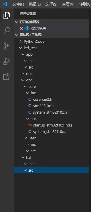 至此,测试实例的基本框架结构创建完成。 下一步,打开Visual Studio Code,将led_test文件夹通过添加工作区文件夹的方式导入到Visual Studio Code工作区中。