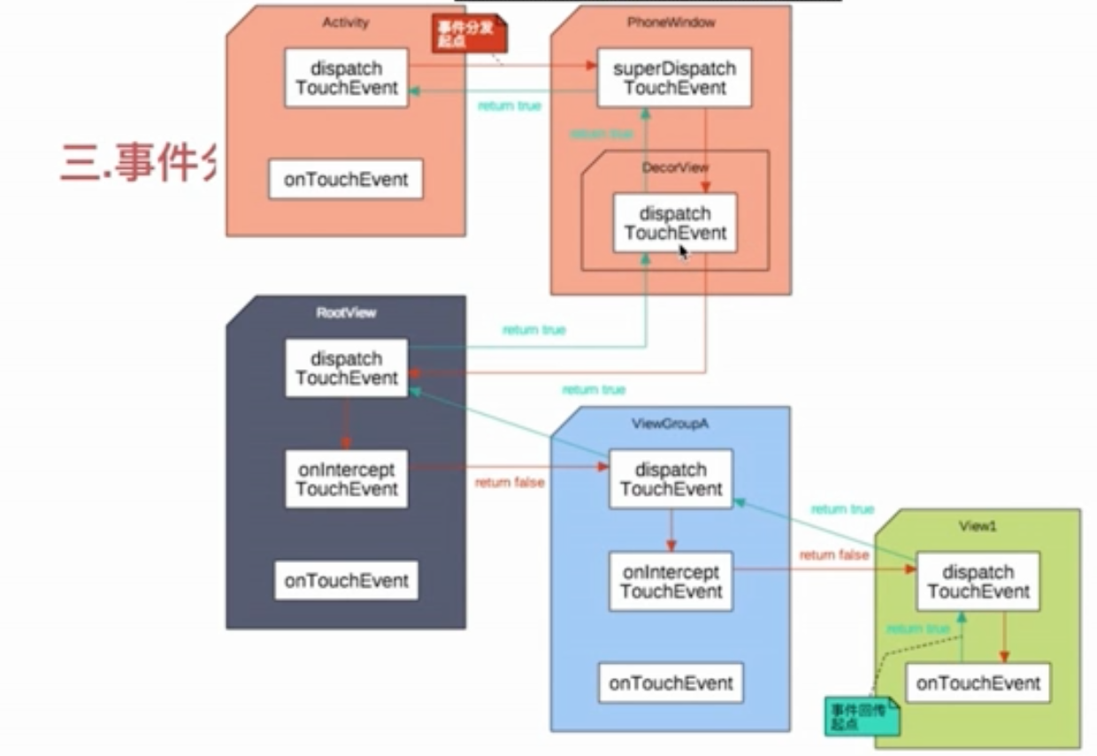 事件分发机制 吴mingman 2020-04-21 199 阅读1分钟 dispatchTouchEvent() onInterceptTouchEvent() onTouchEvent() Activity 与 View 是没有 OnInterceptTouchEvent() 事件分发机制是责任链模式; Activity -> PhoneWindow -> DecorView -> GroupView -> ..... -> View
