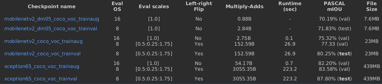 MobileNetv2和MobileNetv3:一个为移动设备设计的快速网络结构Xception:用于服务器端部署的强大网络结构ResNet-v1-{50, 101}:我们提供原始的ResNet-v1及其“ beta”变体,其中对“ stem”进行了修改以进行语义分割。PNASNet: 一个通过神经体系结构搜索发现的强大网络结构。Auto-Deeplab(代码中叫做HNASNet):通过神经体系结构搜索找到的特定于细分的网络主干。