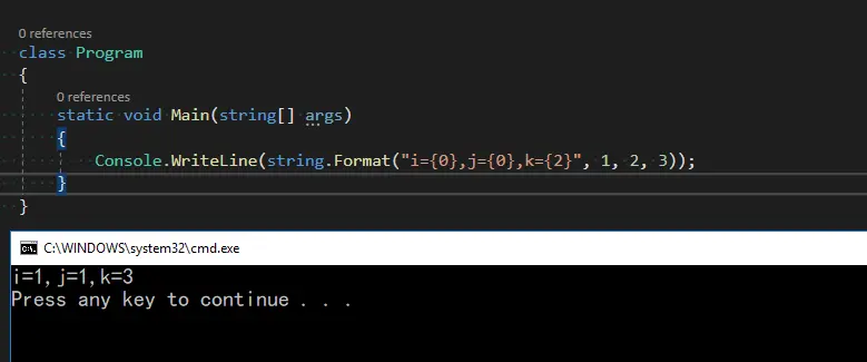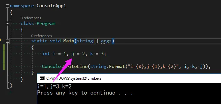 Console.WriteLine($"i={it},j={jt},k={kt}");