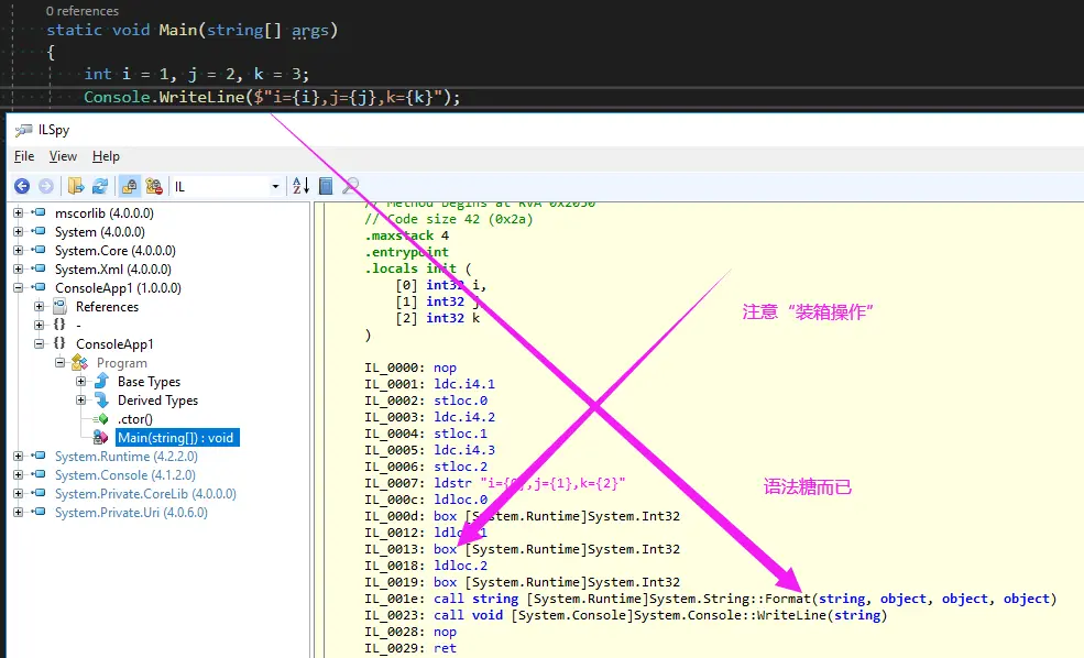 接下来探究一下,内插字符串这种语法糖在IL层面到底是个啥玩意,你可以通过ILSpy工具查看IL代码。