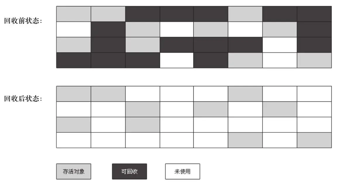 - 标记清除算法(Mark-Sweep) 最基础的垃圾回收算法,分为两个阶段,标注和清除。标记阶段标记出所有需要回收的对象,清 除阶段回收被标记的对象所占用的空间。如下图,该算法最大的问题是内存碎片化严重,后续可能发生大对象不能找到可利用空间的问题。