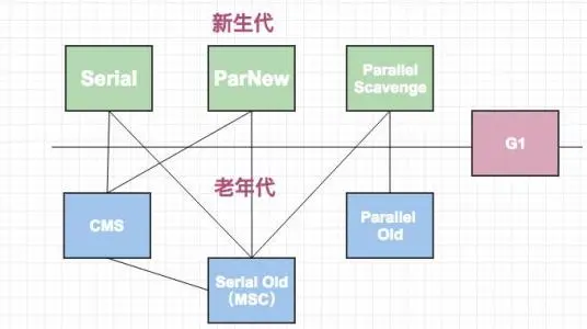下图是目前虚拟机支持的垃圾回收器,以及他们之间组合使用的关系。