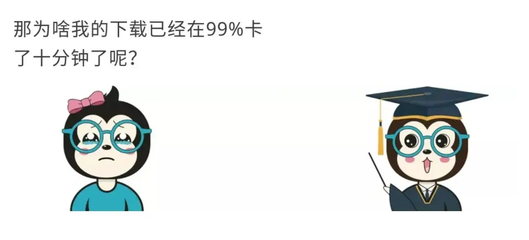 所以,因为采用P2P的下载方式,文件从多个节点下载,由于从各个节点下载的速度不一致,有些节点的资源会相较于其他资源慢一些,就会出现进度卡在99%的情况。