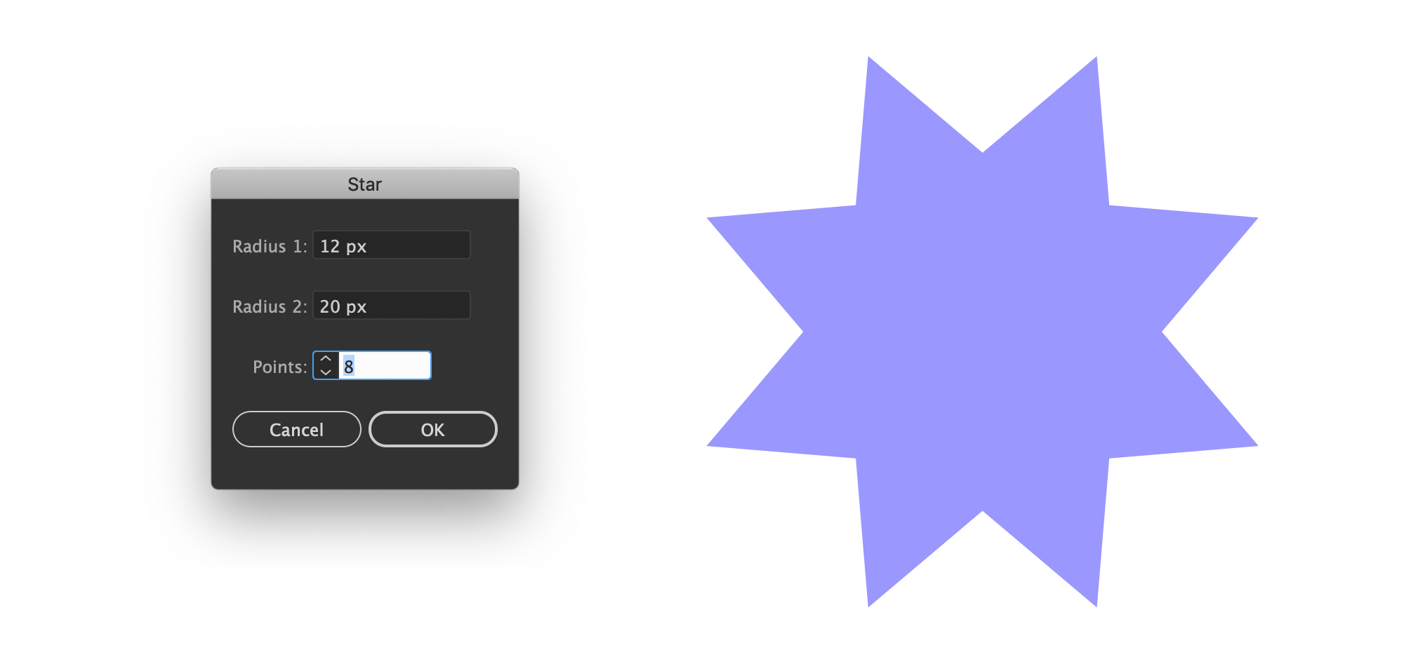 你可以通过画两个正方形来创建一个八角星。按下 Shift 键的同时,拖动 矩形工具(M) 创建一个正方形,选中这个正方形,按下 Shift 键的同时,拖动旋转工具(R) 来旋转 45°。