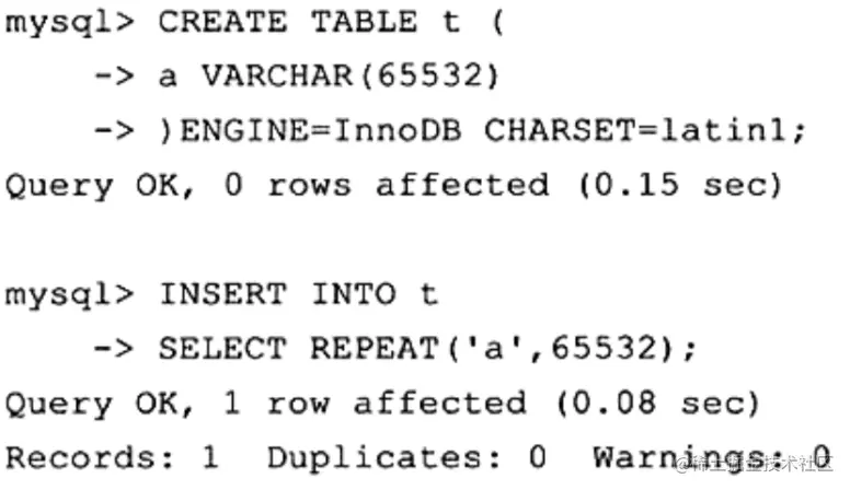 mysql> CREATE TABLE test( a VARCHAR(65532) )CHARSET=latin1 ENGINE=InnoDB;
