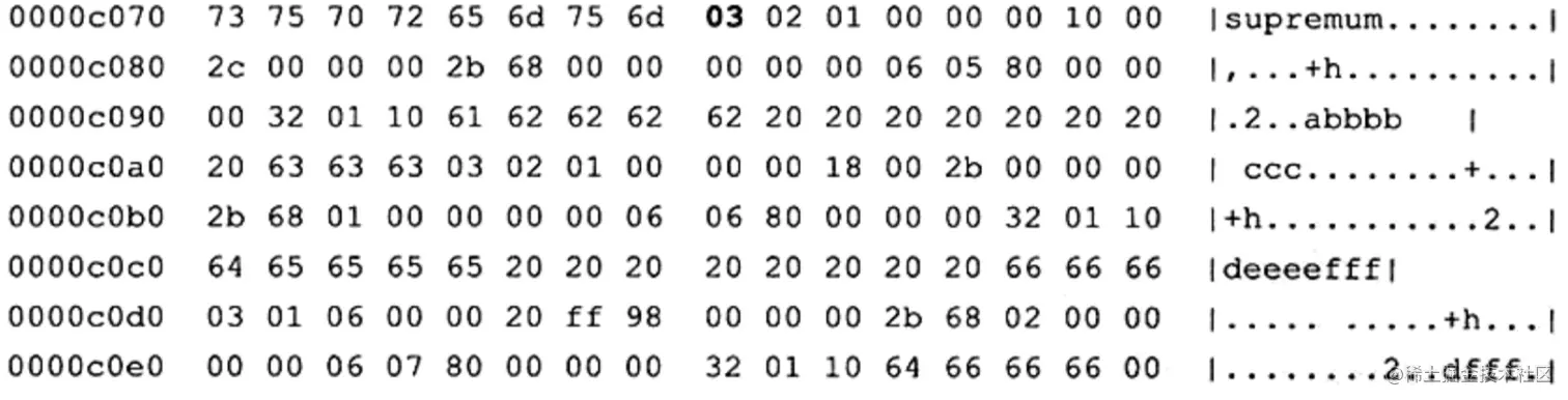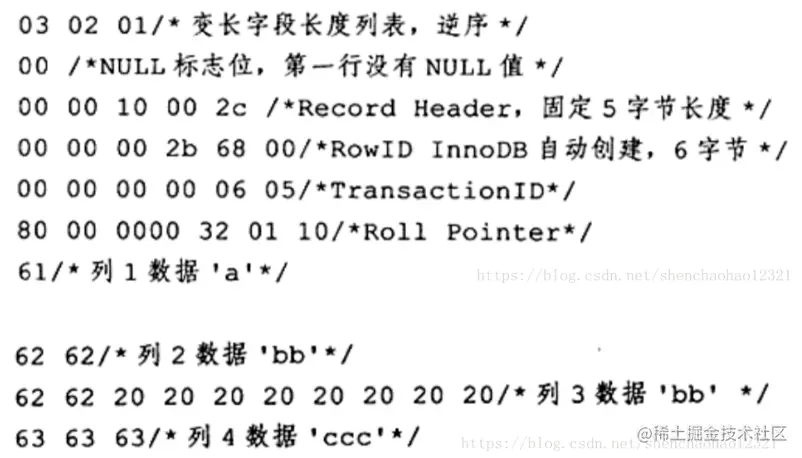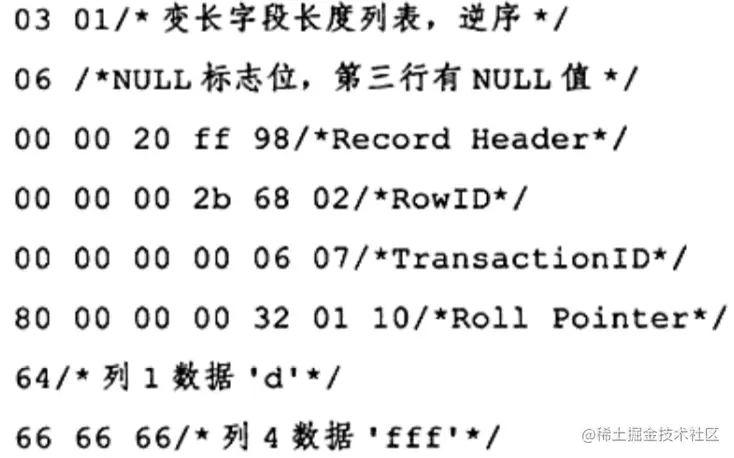 现在第一行数据就展现在用户眼前了。需要注意的是,变长字段长度列表是逆序存放的,因此变长字段长度列表为03 02 01,而不是01 02 03。此外还需要注意 InnoDB每行有隐藏列 Transaction和 Roll Pointer。同时可以发现,固定长度CHAR字段在未能完全占用其长度空间时,会用0x20来进行填充。