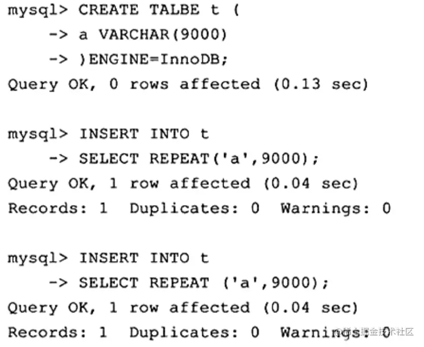 但是,如果可以在一个页中至少放入两行数据,那 VARCHAR类型的行数据就不会存放到BLOB页中去。经过多次试验测试,发现这个阈值的长度为8098。