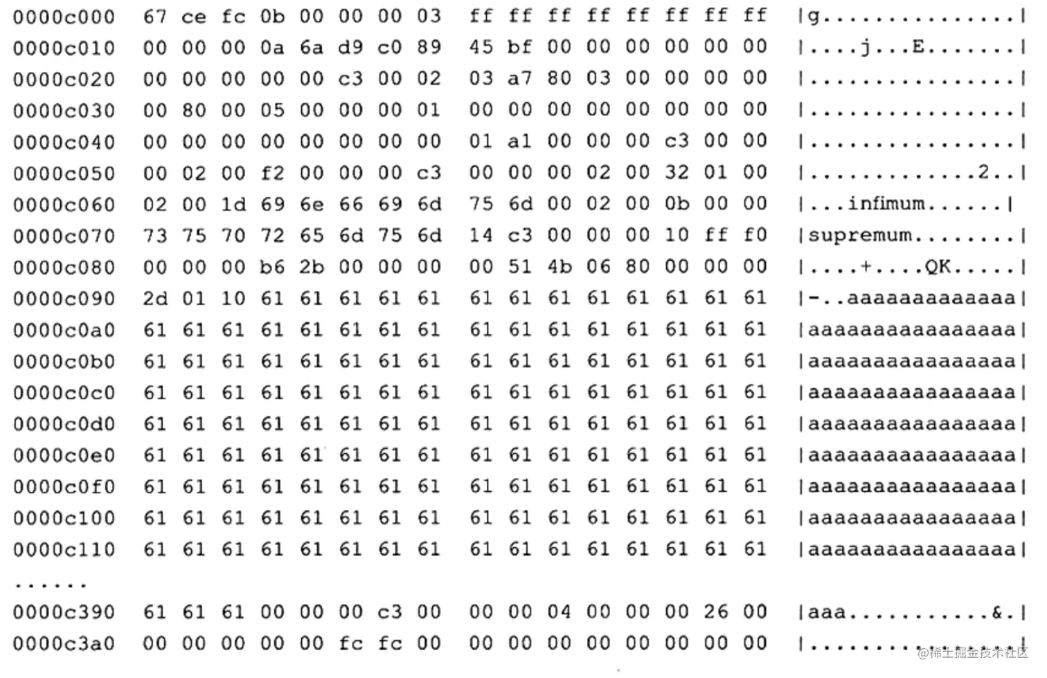 通过工具可以观察到表空间中有一个数据页节点B-tree Node,另外有4个未压缩的二进制大对象页 Uncompressed BLOB Page,在这些页中才真正存放了65532字节的数据。既然实际存放的数据都在BLOB页中,那数据页中又存放了些什么内容呢?同样通过之前的 hexdump来读取表空间文件,从数据页c000开始查看: