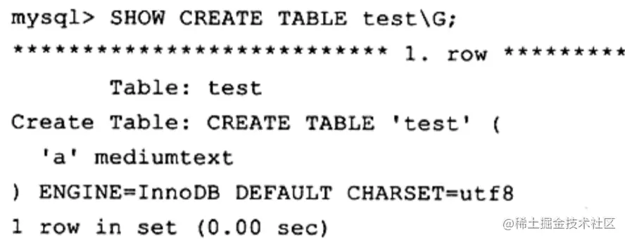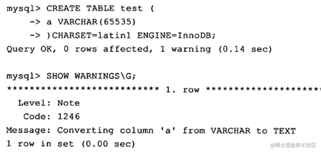 warning信息提示了这次可以创建是因为 MySQL数据库自动地将 VARCHAR类型转换成了TEXT类型。查看test的表结构会发现: