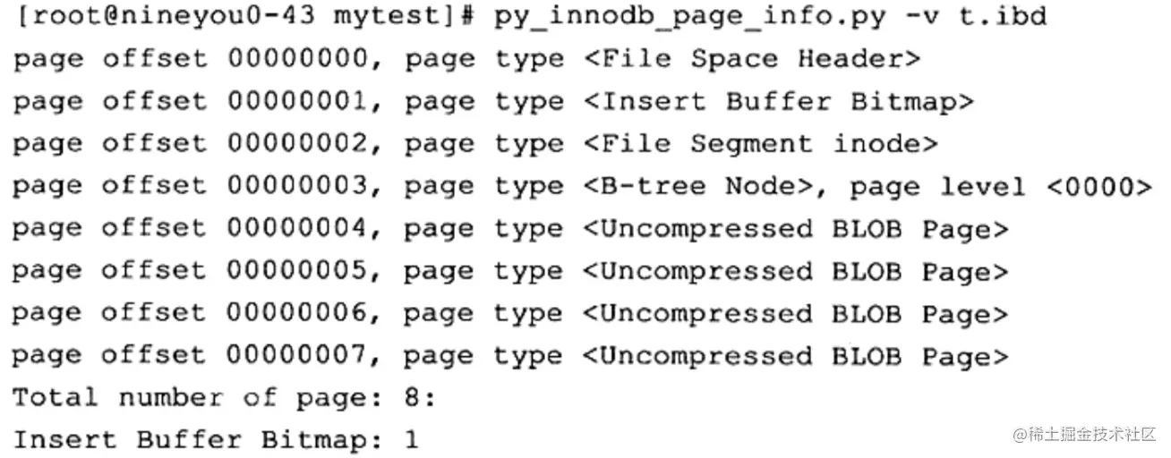 在上述例子中,首先创建了一个列a长度为65532的 VARCHAR类型表t,然后插入了列a长度为65532的记录,接着通过工具py_innodb_page_info看表空间文件,可以看到的页类型有: