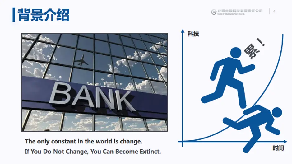 我发现随着时间的推进,金融科技工作者感觉越来越累,因为技术变化是一直存在的,金融科技发展有一个非常快的加速度,并且我觉得未来应该也会延续这种趋势。下面这张图,如果是你能够站上这条曲线,能够追上科技的发展,那就能够利用科技的力量来赋能业务,这就是为什么我们现在这么累,为什么大家感觉科技工作者的节奏越来越快的理解。