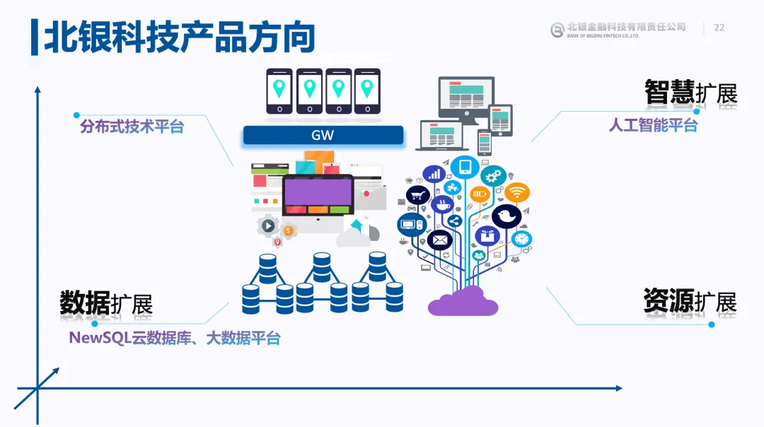 这张图是列的现在比较热的大家都在做的一些技术,包括分布式技术平台,包括人工智能平台,还有一个在底层的数据架构,底层的基础设施上,我们是在与 TiDB 合作,也是一个数据库国产化和平台化的尝试,还包括下边我要讲到的北银科技的一个主力产品。