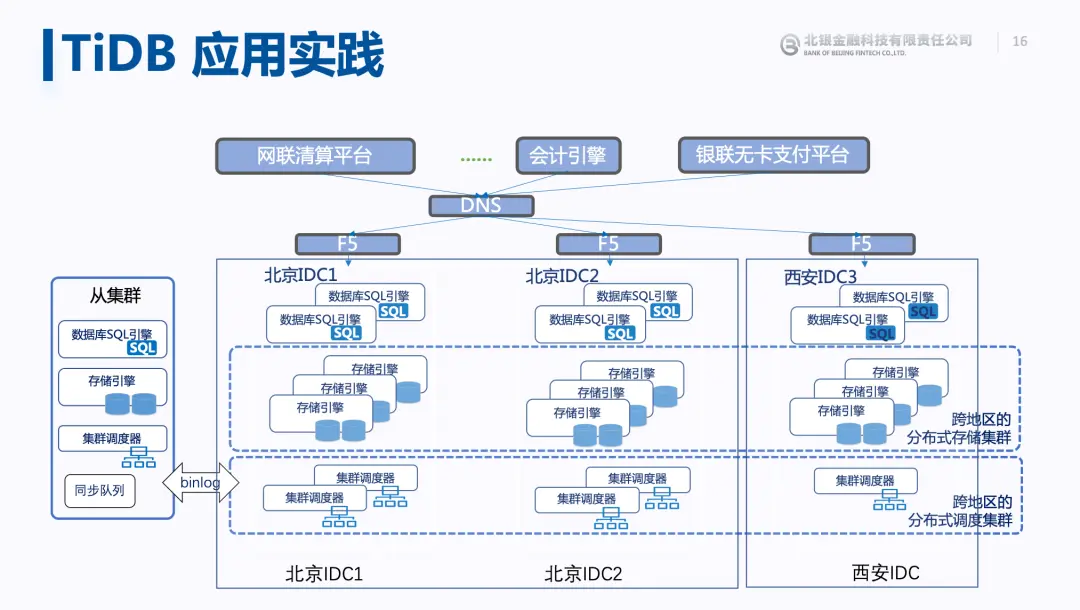我们和 TiDB 的接触是比较早的,主要觉得 TiDB 是国产数据库里面技术比较强的一个,在 2016 年就进行了接触。之前,我们采用的是一体化的数据库的方法。那为什么要做分布式数据库,其实当时也是希望能够从这个数据库的层面能够具备一定的线性扩展的能力,能够打破以往只能在硬件上做纵向升级的情况。北京银行 也是在国内首发了针对面向分布式数据库的评测标准的体系和评测软件。在这里我想强调的是:TiDB 首先是一个 100% OLTP 数据库,我们的选型和测试和最终的上线业务也是基于 OLTP 的场景。
