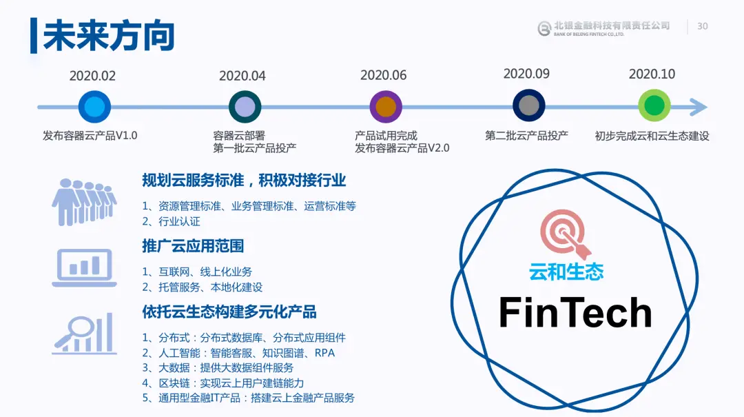 未来的方向,我们是比较务实的,第一个,刚才我介绍了,我们已经发布了容器云的产品,在容器云产品现在也已经进行到了尾声,未来一段时间,我们要更加的面向整个银行的 IT 生态,来推广我们的产品,通过和业务方的对接和业务系统的对接,来产出一些更有价值的功能,预计到今年年底,是要完成整个云生态的初步的一个建设工作。依托与这个容器云产品,我们也要做很多能力上的建设,很多业务方向的建设,包括微服务标准框架、人工智能、智能客服、知识图谱、RPA、机器人等等。