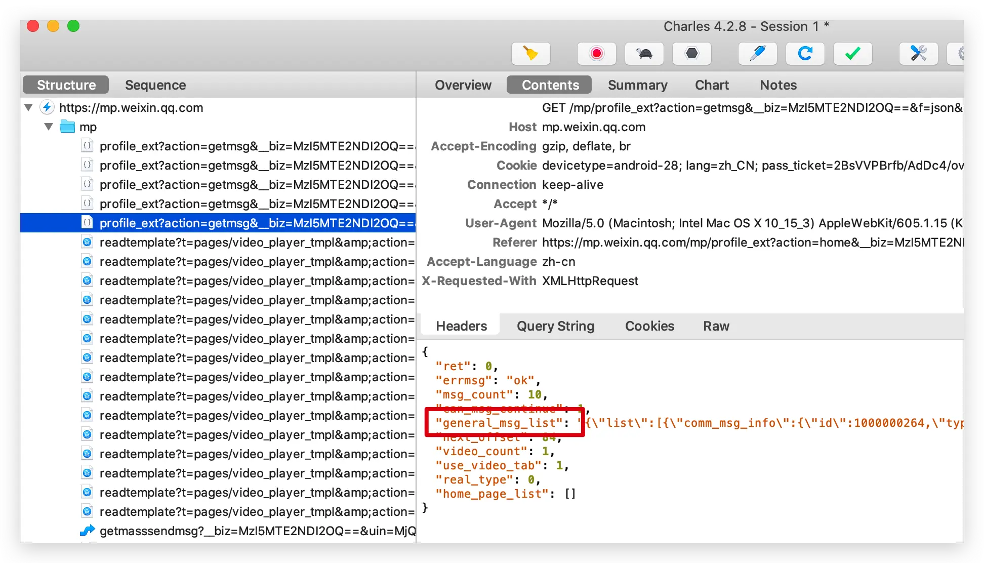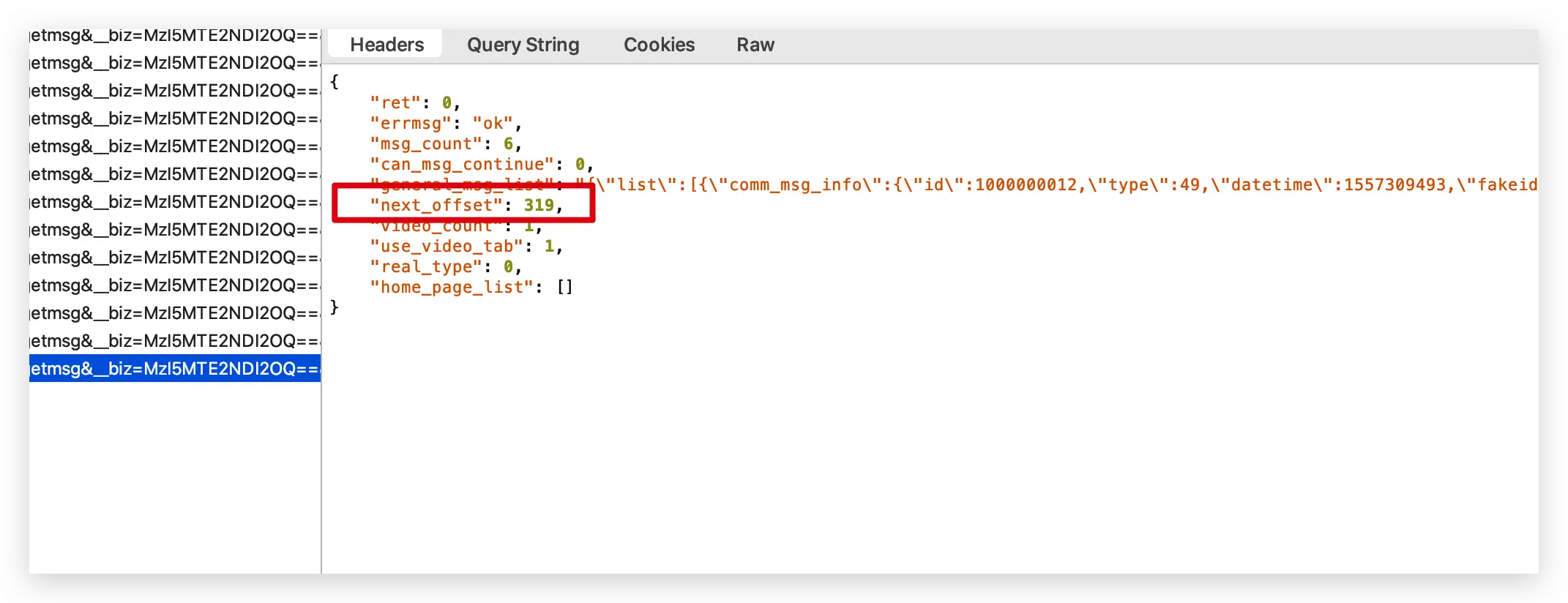我们通过上滑公众号历史文章,在抓取的链接里面我们可以看到请求和具体的返回数据。它的返回是以 Json 信息的形式。文章的链接就在 Json 信息里面。