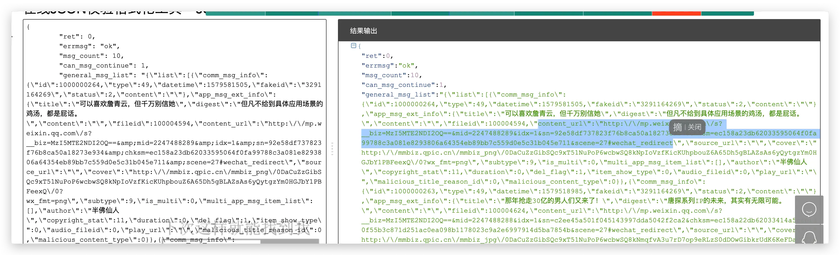这个 Json 看不全,我们复制到在线 json 解析工具里转换一下。