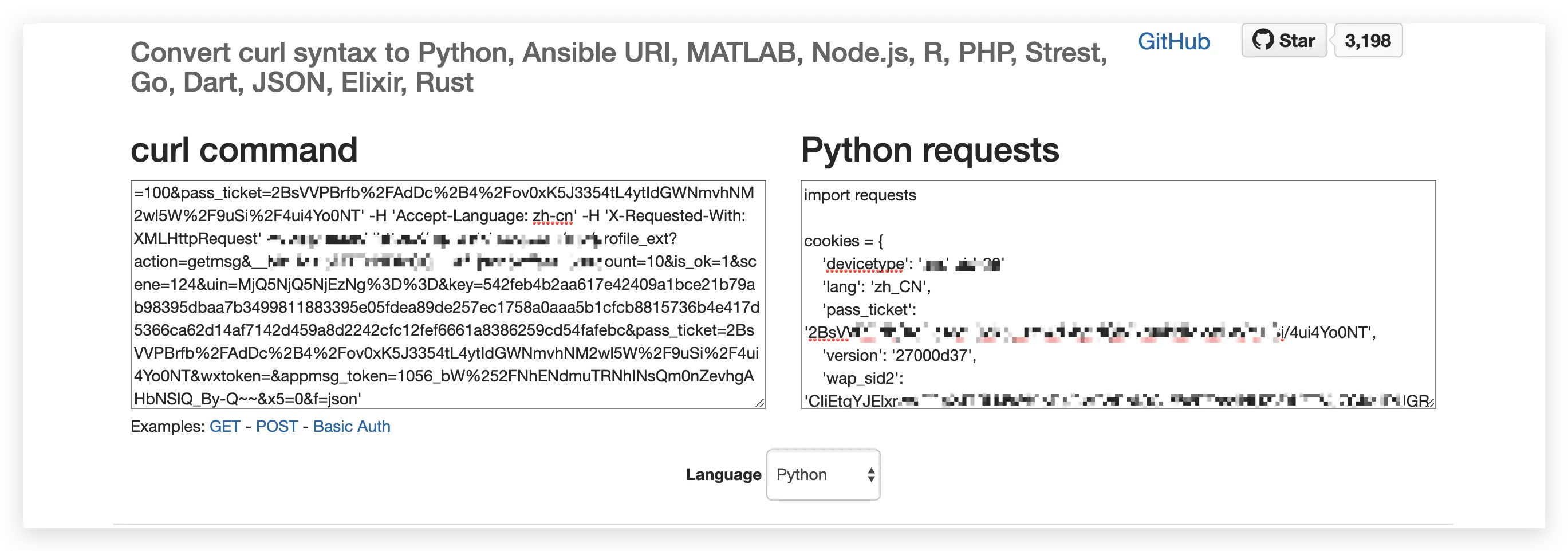 https://curl.trillworks.com/在左边粘贴刚才复制的 curl request,下面的语言默认是 Python。右边就会同步转换为 Python requests。