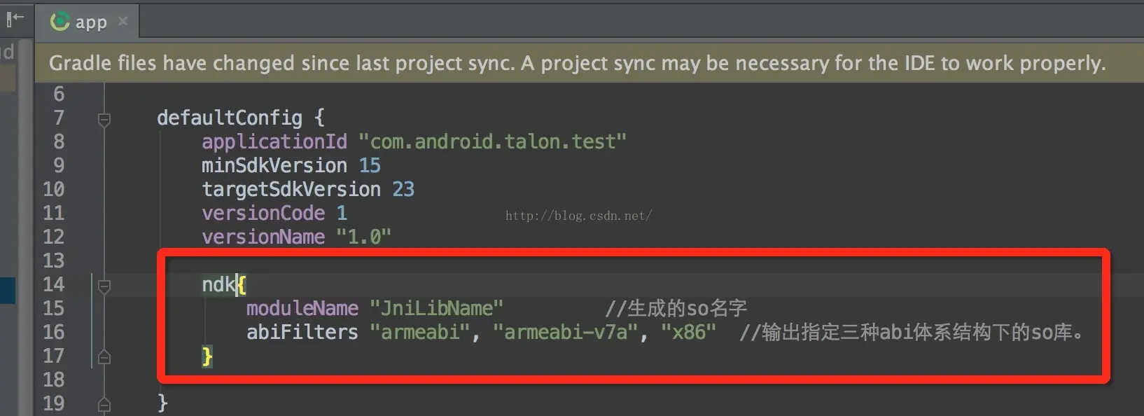 接下来在app module目录下的build.gradle中设置库文件名(生成的so文件名)。找到gradle文件的defaultConfig这项,在里面添加如下内容: