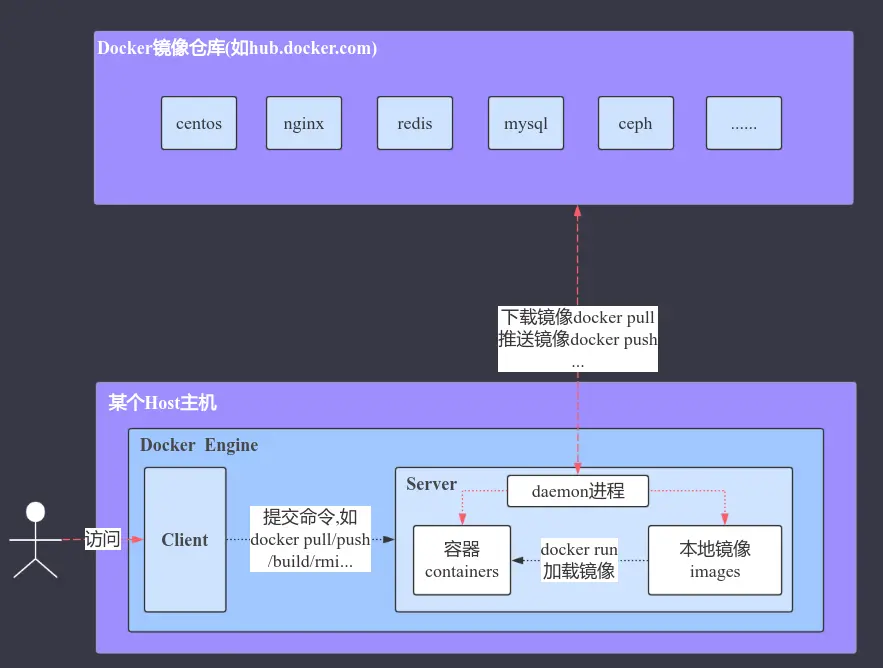 Docker的运行流程原理大概可以参考以下这图,要了解更详细的知识点可参考其官方文档哦。