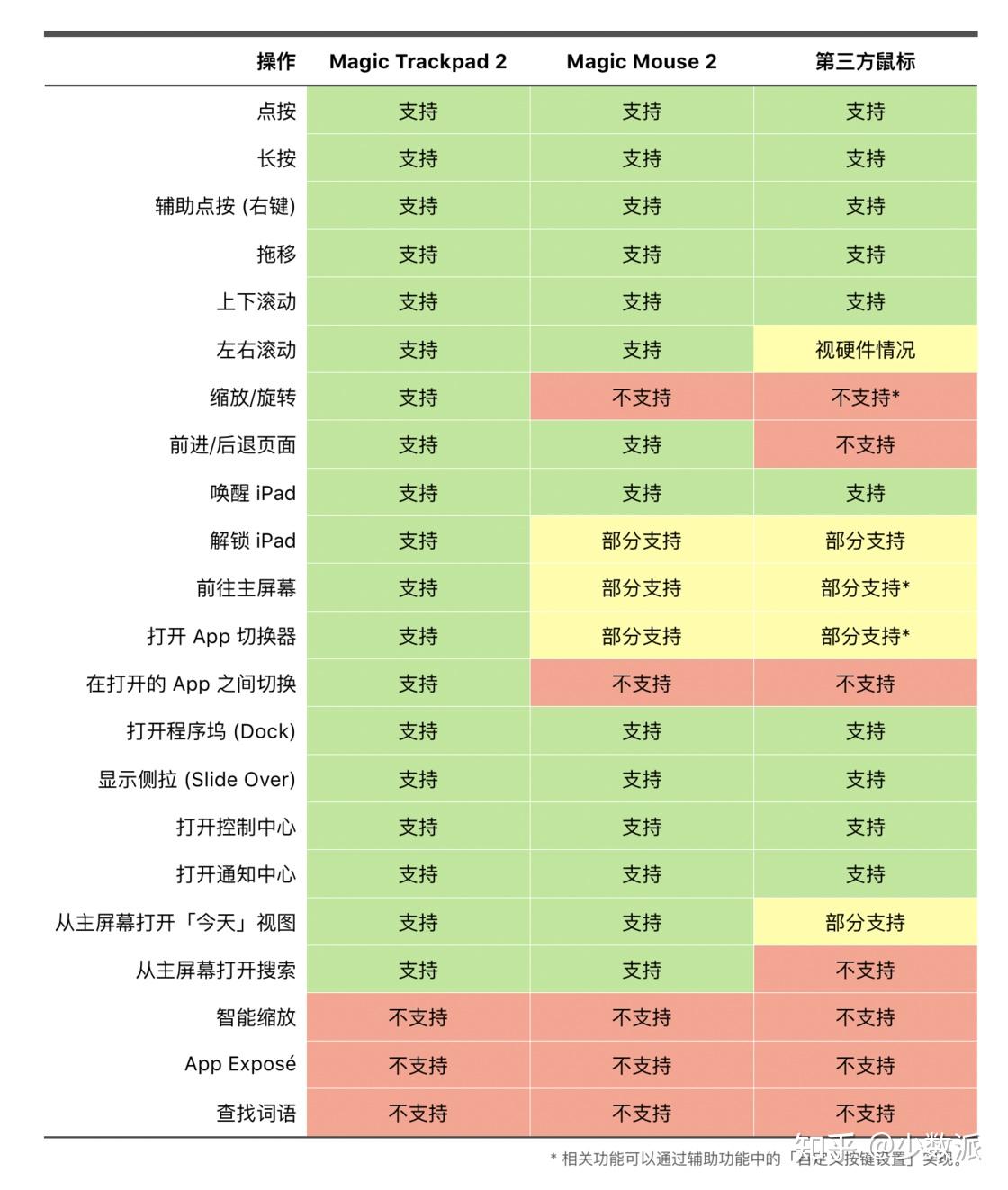 上表中,「支持」是指相关功能可以实现且有专门的手势,可以一步完成;「部分支持」是指相关功能可以实现,但没有专用的手势、需要两步或以上操作才能完成;「不支持」则是指相关功能无法实现。(第三方鼠标可以通过设置「辅助点按」实现部分无法直接支持的功能,表格中以「*」标出,具体见后文说明。)