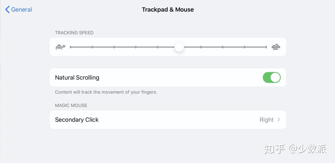 iPadOS 为 Magic Trackpad 提供了一些设置选项。配对后,在「设置」>「通用」下会多出一项「触控板」,其中可以修改跟踪速度(指针的移动速度)并切换自然滚动、轻点以点按和双指辅助点按(即右键)等的开关状态等,但不像 Mac 的触控板设置那样可以逐一开关或修改各个手势。