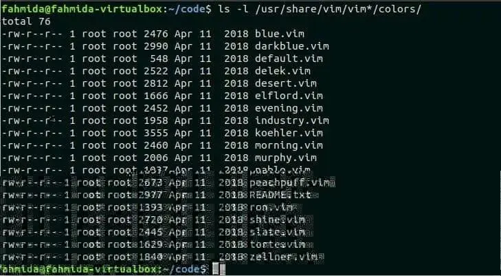 安装 Vim 后,颜色方案文件位于 /usr/share/vim/vim*/colors/ 中。我们可以运行以下命令来查看 Vim 配色方案文件的列表。
