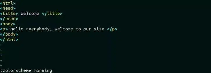 $ vim hello.html按 ESC 并键入 :colorscheme morning ,这样我们就更改了文件当前的颜色方案。