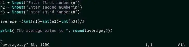 比如现在有一个名为 average.py 的 Python 文件,我们用 Vim 编辑器打开它。通过 Vim 编辑器的默认配色方案,文件的显示效果如下图所示。