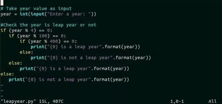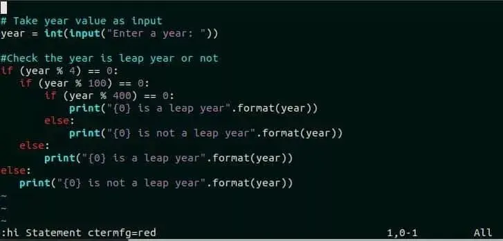 下面举个例子。在 Vim 编辑器中打开名为 leap.py 的 Python 脚本文件。默认情况下,该文件的语法高亮显示如下图所示。