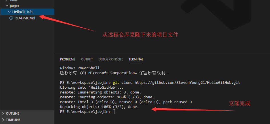 在你的工作区打开命令行输入 git clone 复制的地址 回车即可。