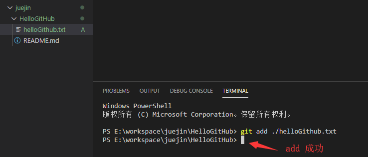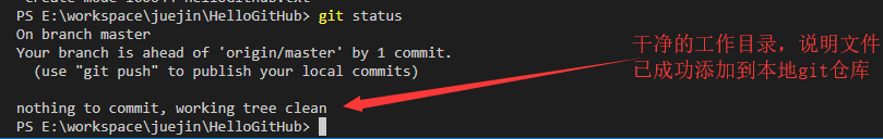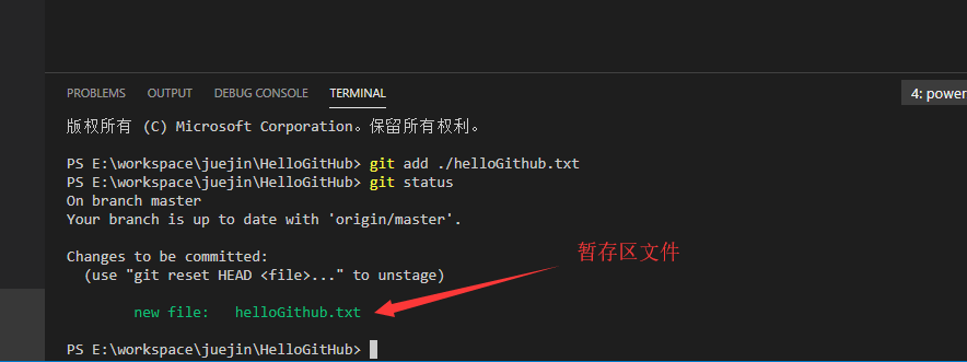 step1. 工作区:你敲代码的地方在工作区编码,使用命令 git add helloGithub.txt 提交至暂存区。