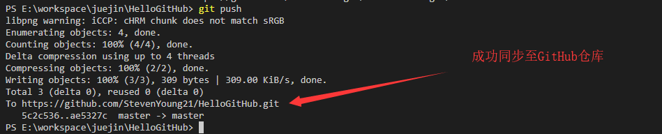 文件提交到Git仓库后,就会生成项目的版本记录。现在就可以使用git push向GitHub云仓库同步项目了。