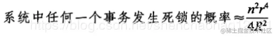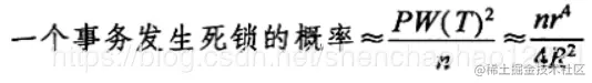 由于大部分死锁发生的长度为2,因此上述公式基本代表了一个事务发生死锁的概率。从整个系统来看,任何一个事务发生死锁的概率为: