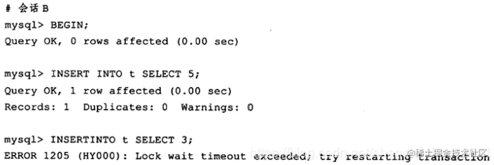 可以看到,在会话B中插入记录5是可以的,但是在插入记录3时,因为会话A中Next-Key Lock算法的关系,需要等待会话A中事务释放这个资源,所以等待后产生了超时。但是在超时后用户再进行 SELECT操作时会发现,5这个记录依然存在。