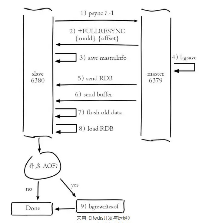 - 全量复制 2. 从节点接收主节点的响应数据保存运行ID和偏移量offset 5. 主节点发送RDB文件给从节点,从节点接受RDB文件保存本地并直接作为从节点数据 6. 从节点开始接收RDB从快照到从节点接收完成期间产生的数据。这期间写数据会放入客户端缓冲区(默认64M) 7. 从节点清空自身旧数据